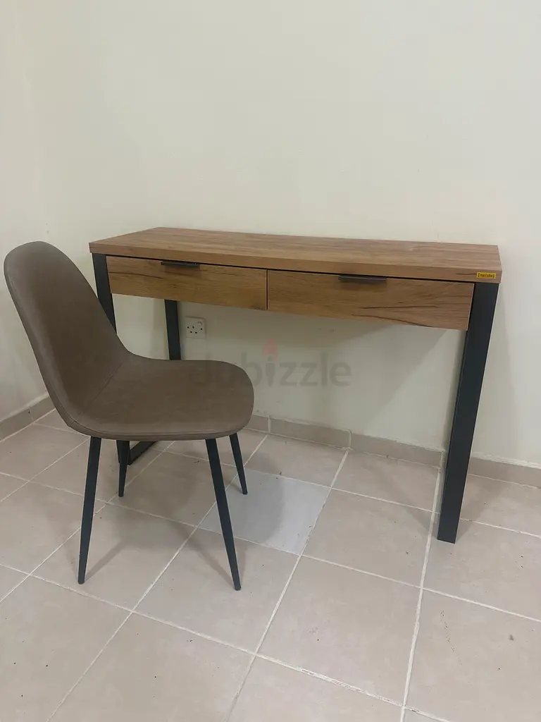 I'm selling a compact Pan Emirates wooden study desk paired with an upholstered single chair. I bought it about 6–12 months ago and have used it lightly, so it's in excellent condition with minimal signs of wear. The desk has a rectangular tabletop with two slim drawers for small items and black metal legs that give it a simple, modern look. The chair is brown upholstered with a comfortable curved seat and matching black metal legs. It fits well in small rooms or home offices and is sturdy for everyday study or laptop use.