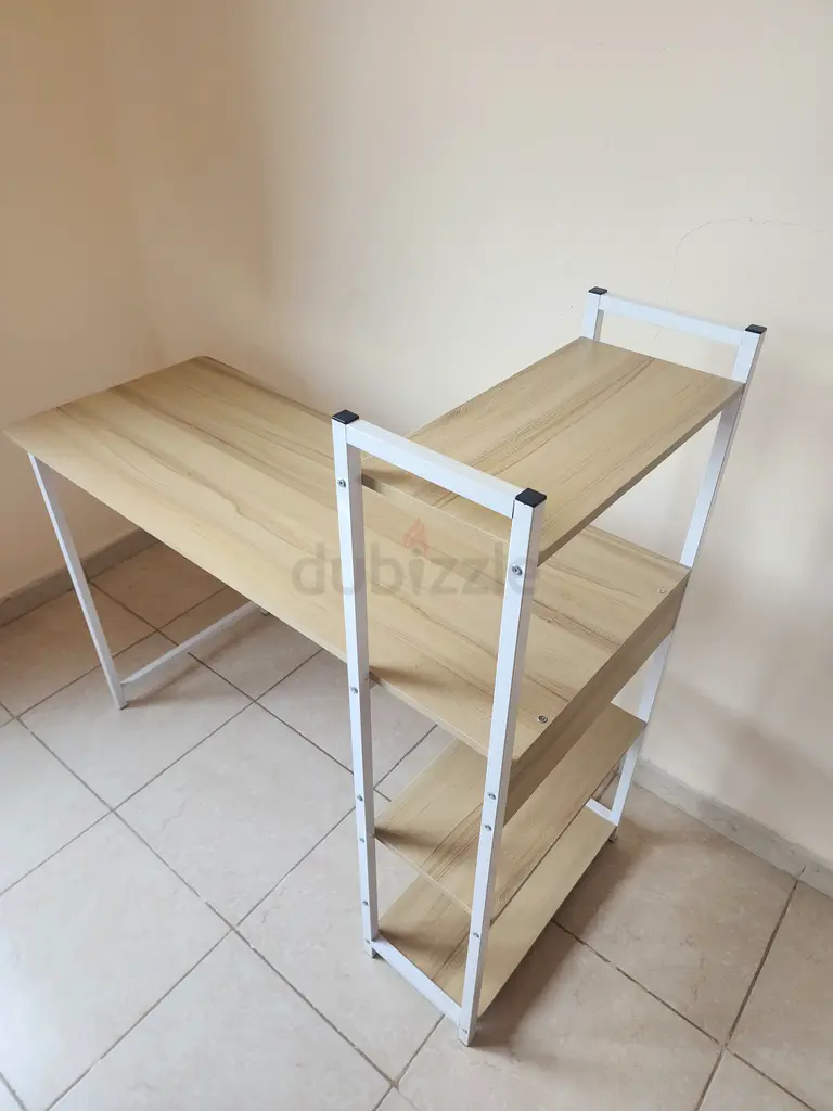 I'm selling a study desk with an attached shelving unit that I've used for about 12 months. The frame is white metal and the surfaces are a pale wood finish. It's been lightly used and is in excellent condition with no visible damage or stains. The desk fits one person comfortably and includes four open shelves on the right-hand side for books, storage, or decorative items. Assembly is simple and the design is practical and compact, suitable for a home office or study corner. Pickup only.