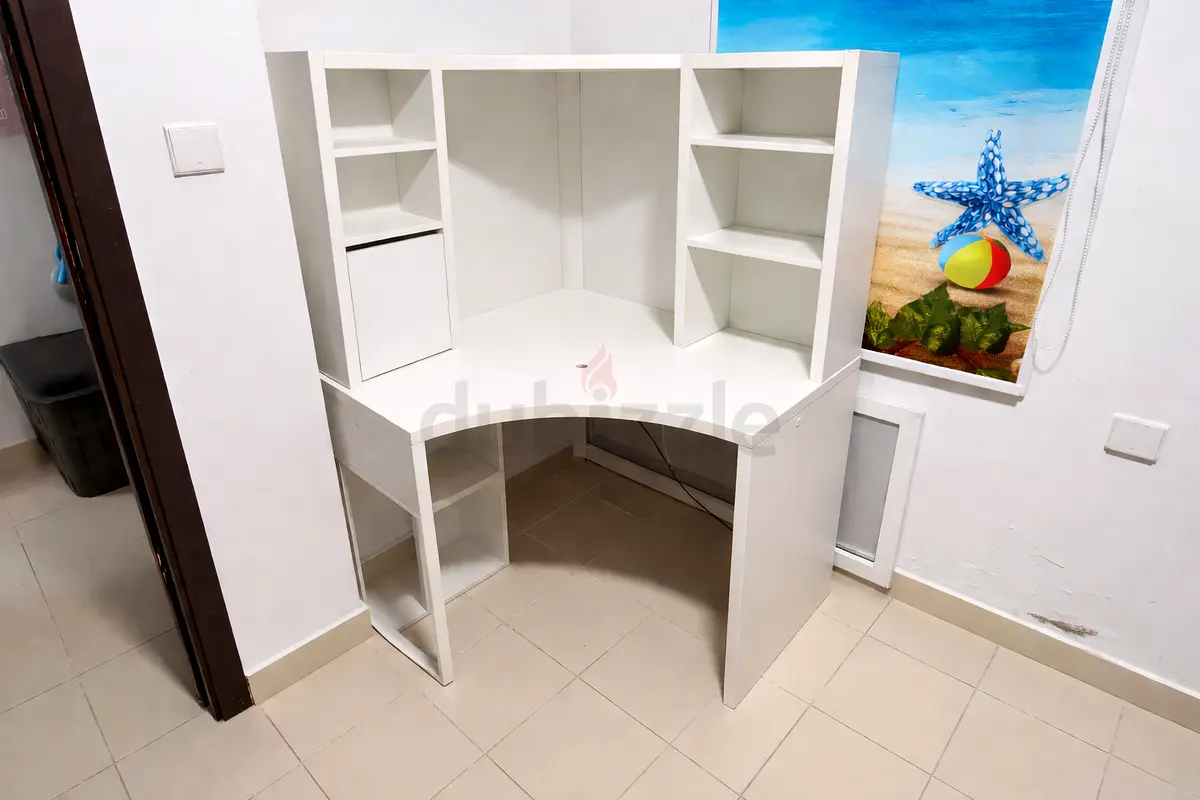 I'm selling a stylish corner study table that is brand new and in flawless condition. The table features an L-shape design, making it ideal for maximizing corner spaces in your home. With a single seating capacity, it’s perfect for personal use, whether for studying or working from home. MICKE Corner workstation currently disassembled, has tear and wear and scratches, in good usable conditions. Asking AED125, van deliver and help assemble if required.