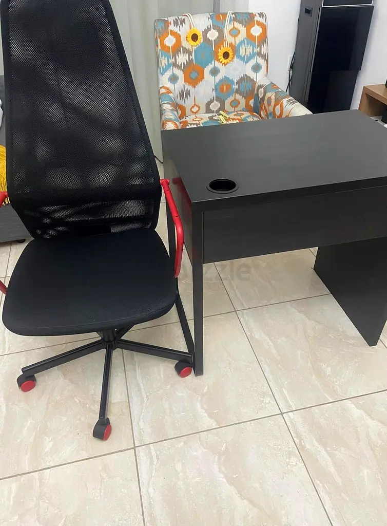 I'm selling my compact computer desk with an ergonomic mesh office chair as a set. I bought them about 6mobths ago and they have had light use. Both are in good condition. The desk is black, rectangular and compact — it has a cable grommet on the top for tidy wiring. The chair has a black mesh back with a cushioned seat, a swivel base and caster wheels, suitable for one person. I'm listing this under Furniture, Home & Garden > Study Tables & Computer Tables.