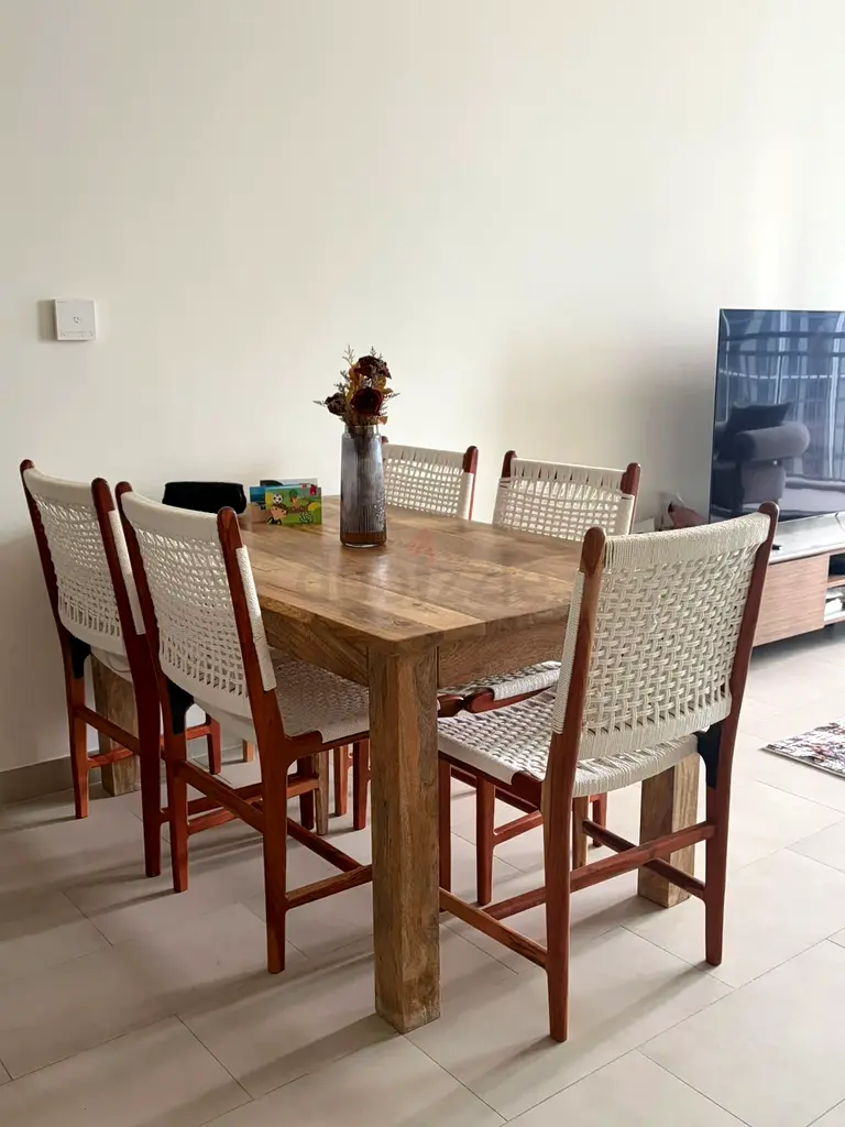 I’m selling my solid wood dining table. I bought it about 6–12 months ago and it has seen light use — it’s in excellent condition. The table is rectangular with a brown finish and a sturdy solid wood build. The six chairs have wooden frames with woven seats and backs that are comfortable and add a casual, natural look. The set is practical for daily family meals and fits well in a dining area or open-plan living space. Includes one table and six chairs for an additional price to be negotiated