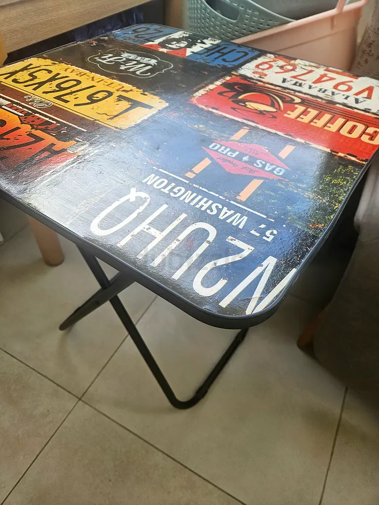 I'm selling a vintage-style rectangular coffee/side table with a printed top. I bought it about 1–2 years ago and have used it normally; it's in good condition with minor surface wear from regular use. The table has a multicolor printed top with retro signs and coffee-themed graphics, and a simple square-ish shape with black metal legs that seat up to two people comfortably for casual use. It’s sturdy and practical for a living room or balcony, and the printed surface gives it a distinct vintage look. Specifications/features: