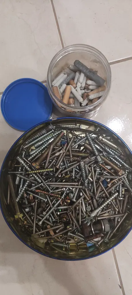 - Contents: Mixed screws, wall plugs and anchors (various sizes and types)