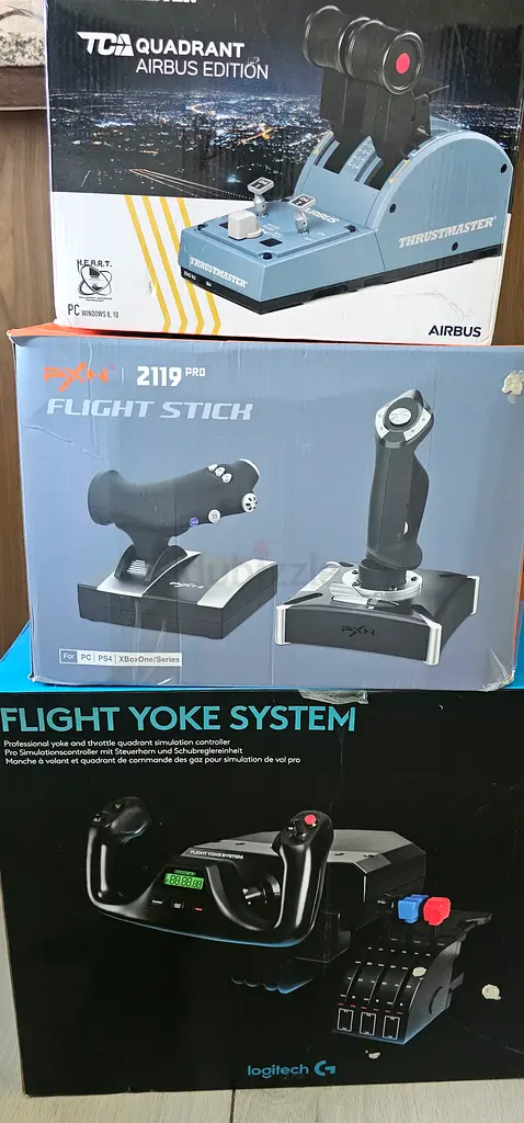 I'm selling a complete cockpit-style controller bundle I used for home flight sims. It includes a Logitech flight yoke with quadrant and trim, a Thrustmaster TCA Airbus Edition throttle quadrant, and a separate joystick (boxed) — the middle box says “Flight Stick 2119 Pro” but I don’t have extra brand details, in excellent condition and have seen light usage. Everything powers on and functions as expected; there are no visible cracks or heavy wear on the housings or buttons. I’m including the pictured units as a set only. Pickup in UAE preferred ,I bought them about a year ago and used them sparingly for about 15 days, then I haven't used them since.