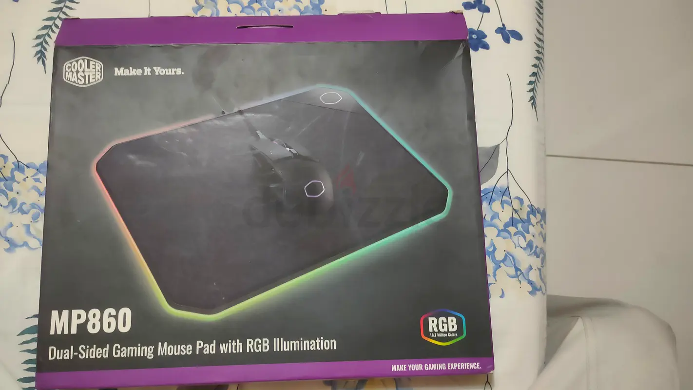 I'm selling my Cooler Master MP860 dual-sided gaming mouse pad with RGB illumination. It is brand new, never used, and in excellent condition. The original box is included (the box shows some wear as seen in the photos). The pad offers dual-sided surfaces and RGB lighting suitable for PC gaming setups.