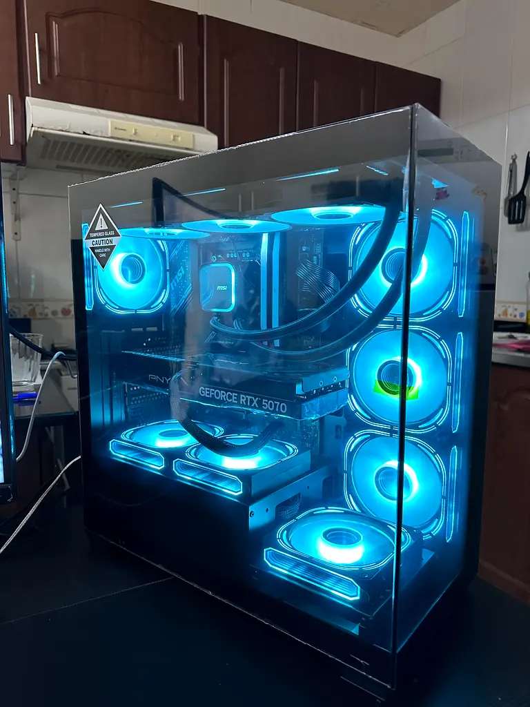 I’m selling my high-end gaming desktop and included 4K monitor. The PC is about 1–6 months old and in excellent condition — barely used for light gaming and general use. It’s built with an Intel Core i5 processor, 32 GB RAM, and a 1 TB SSD. The GPU is an NVIDIA RTX 5070 (visible inside), and the case is a tempered glass RGB chassis with multiple RGB fans and liquid cooling visible in the photos. The system boots quickly, runs games and creative apps smoothly, and comes with remaining warranty. I’m including the 27 inch monitor Samsung odyssey g5 as shown in the listing. No faults, comes with power cables and original accessories I have.