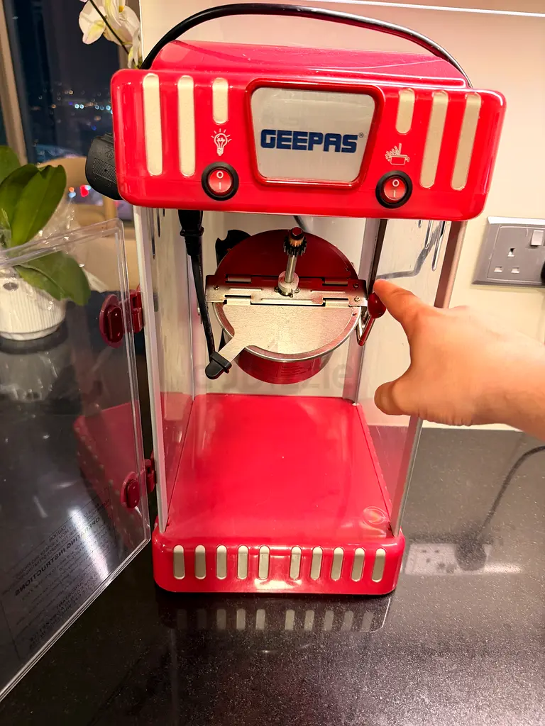 I'm selling my red GEEPAS popcorn maker. It's about 2–5 years old and in good condition — works fine with normal daily use. I used it occasionally at home for fresh popcorn; heating element and stirrer are functional and the glass panels are intact with minimal surface marks. No warranty left. Comes as shown in the photos with the removable kettle and lid for easy cleaning.