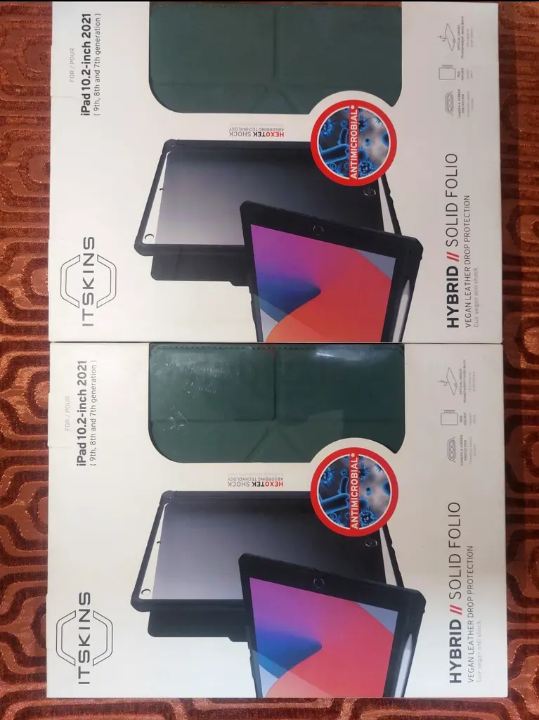 brand new ITSKINS Hybrid Solid Folio case for the iPad 10.2-inch (2021). It’s still in the original sealed box and has never been opened or used. The folio provides full front and back protection and supports multiple viewing angles. Color appears to be dark green (as shown on the box).