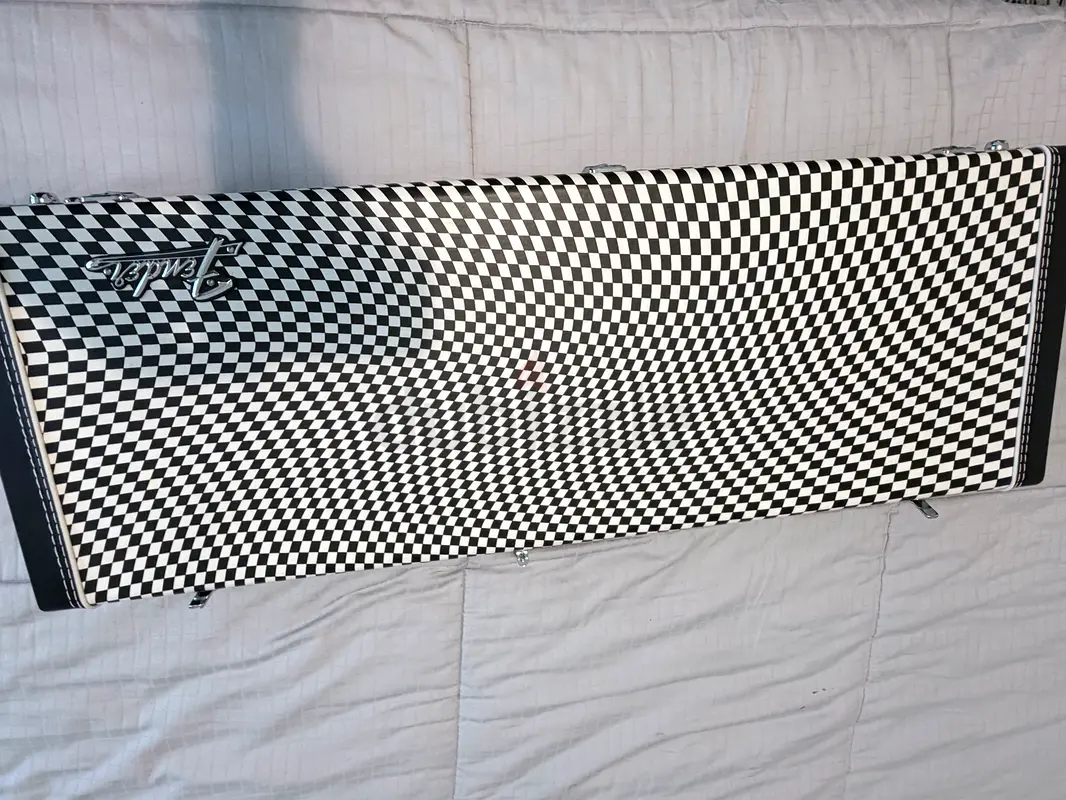 I am selling a vintage checkered guitar case that has been used for about 1-2 years. It's in excellent condition, with no major scratches or damage. The checkered design gives it a unique look, and it features a sturdy handle and reliable latch. This case has seen normal usage and still functions perfectly for protecting your guitar. It's great for musicians who want to keep their instrument safe while on the go.