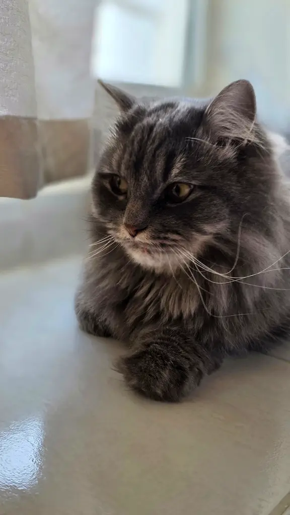 He's already had a really rough time outside. He was found in Musaffah Abu Dhabi not sure abandoned or lost. But the garage guys said he's been there a while and when I took him he was really afraid. He is with me at home in Khawaneej Dubai now. He's a very sweet cat but he is scared of loud sounds and he needs time to settle in.
