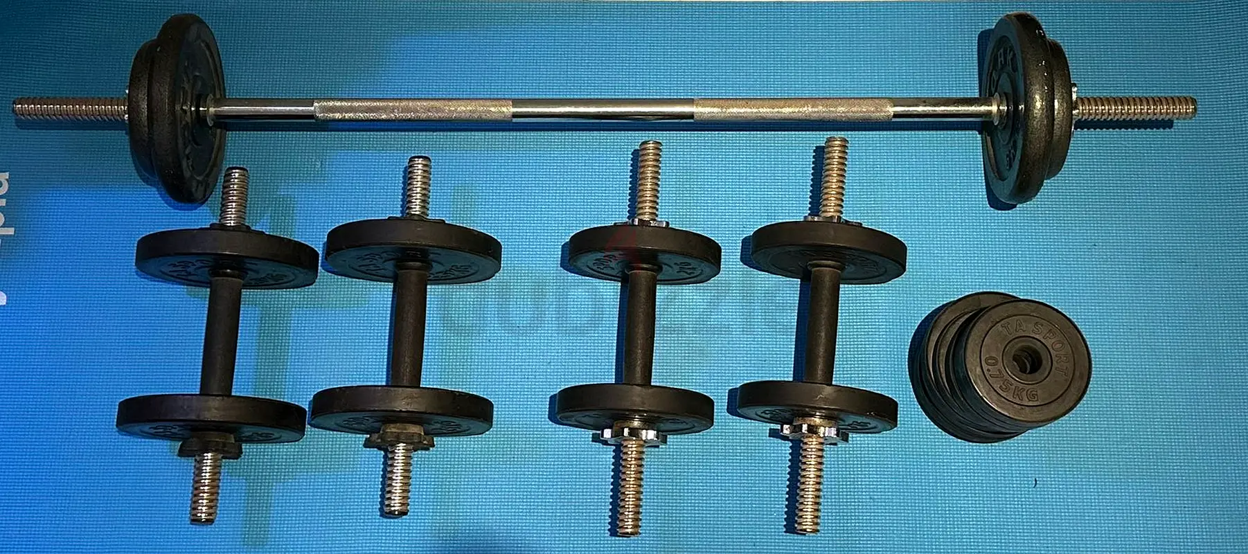 - Includes: 1 long bar, 4 short dumbbell handles, multiple weight plates, spin-lock collars