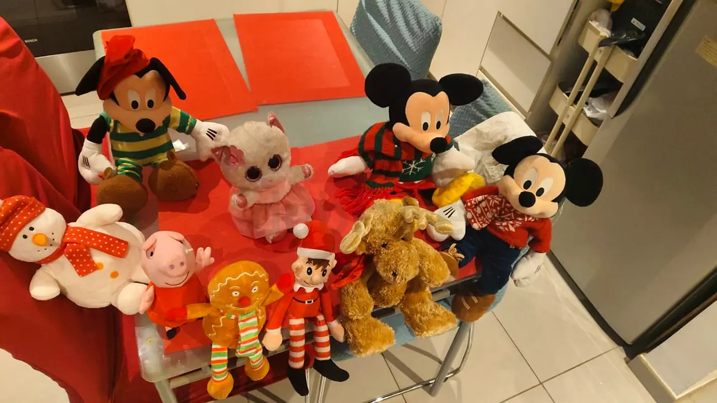 I'm selling a bundle of assorted plush toys I've had for about 2–5 years. They’re in good condition— no major stains or rips, seams intact, and stuffing holds its shape. The group includes several character plushes (Mickey Mouse variants, Minnie-style elf, Peppa Pig, Elf on the Shelf, a snowman, a gingerbread/striped elf, a small pink unicorn/kitty, and a brown dog/rabbit plush). Sizes vary between small to medium (handheld to about cushion size).