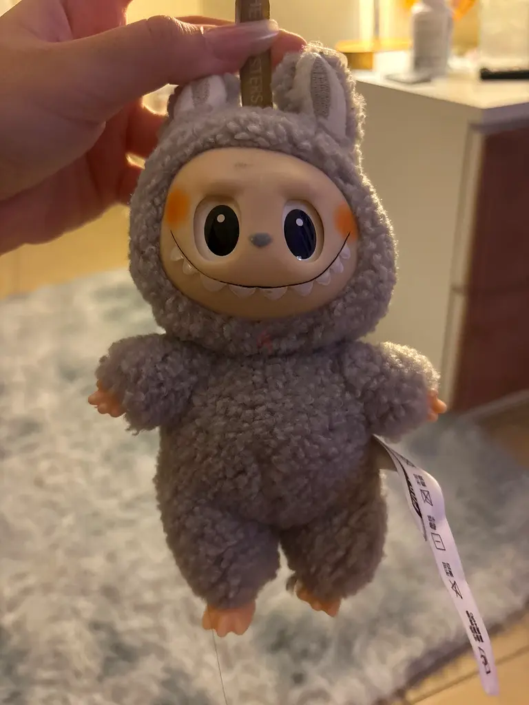 I'm selling a small collectible plush doll wearing a fuzzy sheep/monster costume. The doll is about palm-sized with a soft, grey sherpa outfit, plastic face with painted eyes and cheeks, and small molded hands and feet. It’s in good condition with light usage — no visible stains or tears on the costume; the plastic face has minor scuffing consistent with gentle play. The original tag is still attached. Perfect as a display collectible or for gentle play.