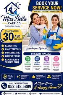 🧹✨ PROFESSIONAL CLEANING SERVICES ✨🧹 Looking for reliable, affordable, and high-quality cleaning services in Dubai? Ms Bella Care Co is here to make your space spotless! ✅ Our Services Include: • Apartment & Villa Cleaning • Stud