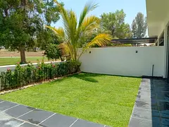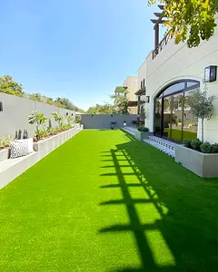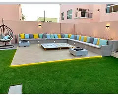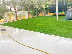 Beautiful Green Lawn with Trampoline and Pool