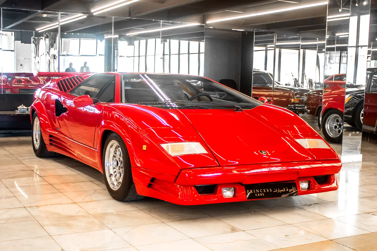 The 1991 Lamborghini Countach is a rear-wheel-drive, mid-engined sports car powered by a naturally aspirated V12 engine. It features a 5-speed manual transmission, a 5.2 L engine producing 455 horsepower and 369 lb-ft of torque, and has a performance-oriented specs like a 4.8 second 0-60 mph time and a top speed of 190 mph. Key features include 15- inches alloy wheels, ventilated front brakes, power steering and air conditioning.