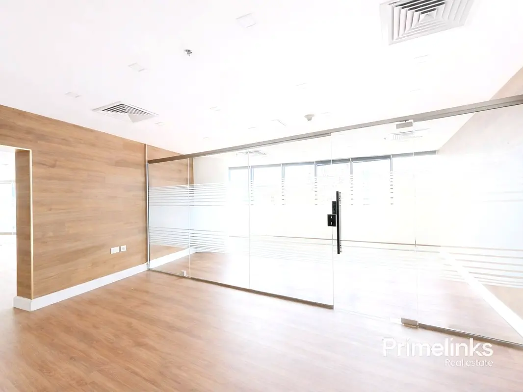 As shown in the photos, the office is configured into three spacious private rooms, each enclosed with high-quality glass partitions and frosted detailing, allowing excellent natural light while maintaining privacy and professionalism. Warm wood-finish flooring, clean architectural lines, and a modern ceiling with integrated lighting and AC vents enhance the executive appeal of the space.