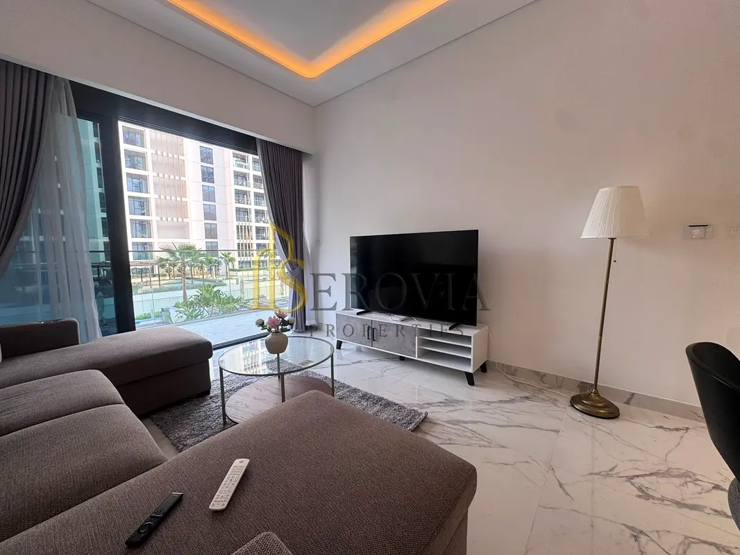 This furnished 1-bedroom apartment for rent in Azizi Riviera 63, Meydan One, offers a practical layout with a pool-facing living area and bedroom. The home features an open-plan kitchen and living space, a well-finished bathroom, and a balcony with views over the communal pool and surrounding community.