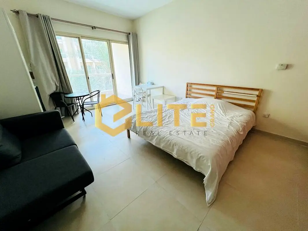 This residential studio apartment for rent in Al Samar 4, The Greens, offers a practical layout with a combined living and sleeping area. The unit is partially furnished, includes a functional kitchen, and opens onto a balcony with pleasant courtyard and city views.