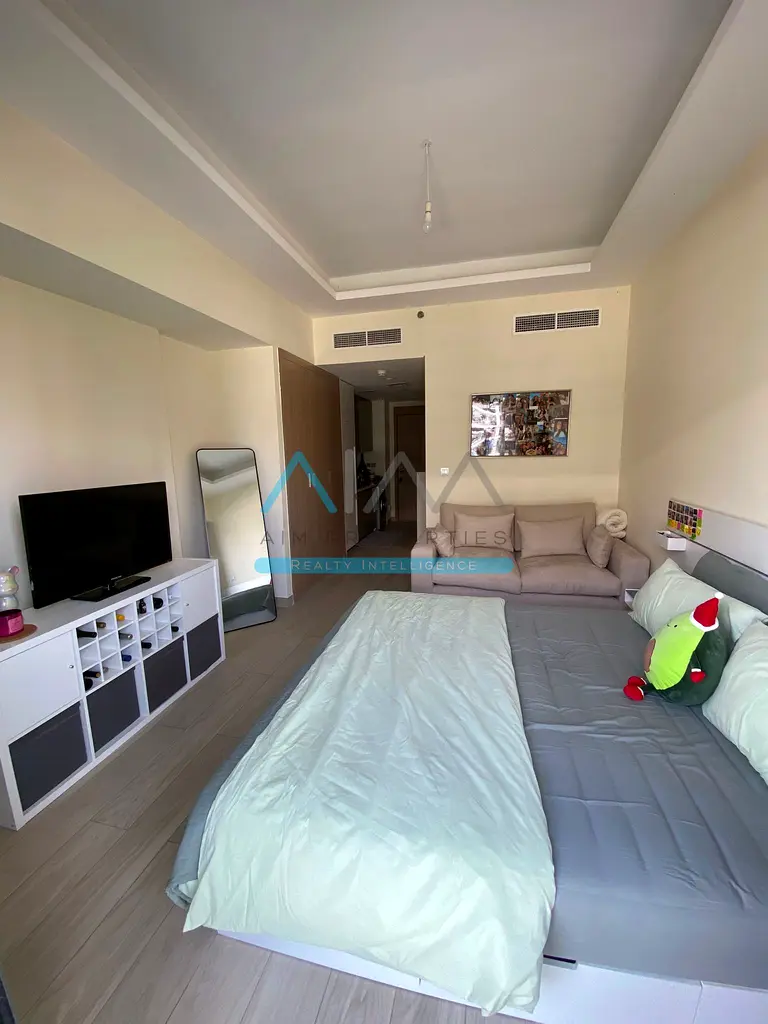 This furnished studio apartment for rent in Azizi Riviera 13, Azizi Riviera, Meydan One, offers a practical layout in a well-connected residential community. Located in Dubai’s Meydan area, the unit is designed as a studio with a combined sleeping and living space, a modern bathroom, and a compact kitchenette. Floor-to-ceiling windows and a balcony provide garden and road views along with good natural light.