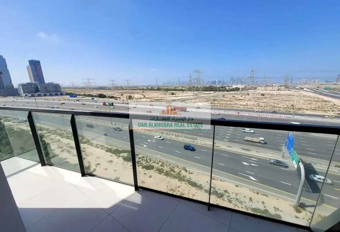 2-bedroom apartment for rent in Binghatti Gate, Jumeirah Village Circle (JVC), Dubai. The home offers an open-plan layout with an integrated kitchen and bright living area leading to a balcony. Multiple sliding glass doors and windows provide natural light and showcase city and community views across the surrounding area.