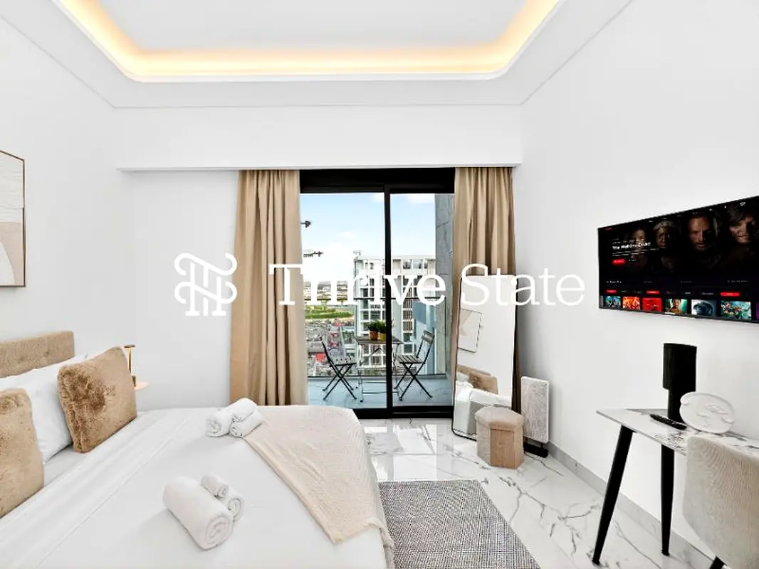 Thrivestate Square Real Estate is proud to offer this Furnished studio apartment for rent in Azizi Riviera 61, Meydan One, Dubai. This well-planned residential unit is set on a mid-floor and offers a practical layout with sleeping, working, and living zones combined in one space. Large sliding doors open to a private balcony with open downtown-style city views, enhancing natural light throughout the apartment.
