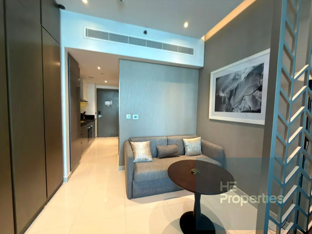 This furnished studio apartment for rent is located in Damac Maison Prive Tower A, Business Bay. Situated on a mid–high floor, it offers a practical open-plan layout with sleeping, living and kitchenette zones, along with a private balcony. The apartment overlooks the communal pool, canal-style waterway and nearby towers, providing a mix of pool, marina-style and downtown city views.