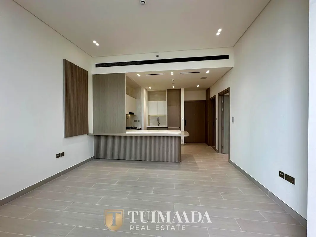 Presented by Tuimaada Real Estate Buying and Selling Brokerage LLC, Spacious 1-bedroom apartment for rent in Binghatti Royale, Jumeirah Village Circle (JVC) District 18, Dubai. This high-floor residence offers an open-plan layout with modern finishes, multiple floor-to-ceiling windows, and a private outdoor plunge pool. The unit is unfurnished, giving flexibility to arrange the living, dining, and bedroom spaces to your preference.