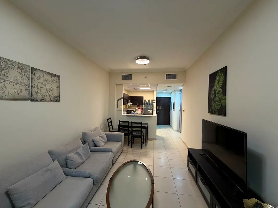 This 1-bedroom apartment for rent in Mazaya 6, Queue Point, Liwan, offers a practical layout with an open-plan living, dining, and kitchen area. The home comes furnished in the living spaces and bedrooms, with neutral finishes and tiled flooring throughout. Multiple sliding doors and windows provide natural light and access to outdoor balcony/terrace spaces. Key Features: