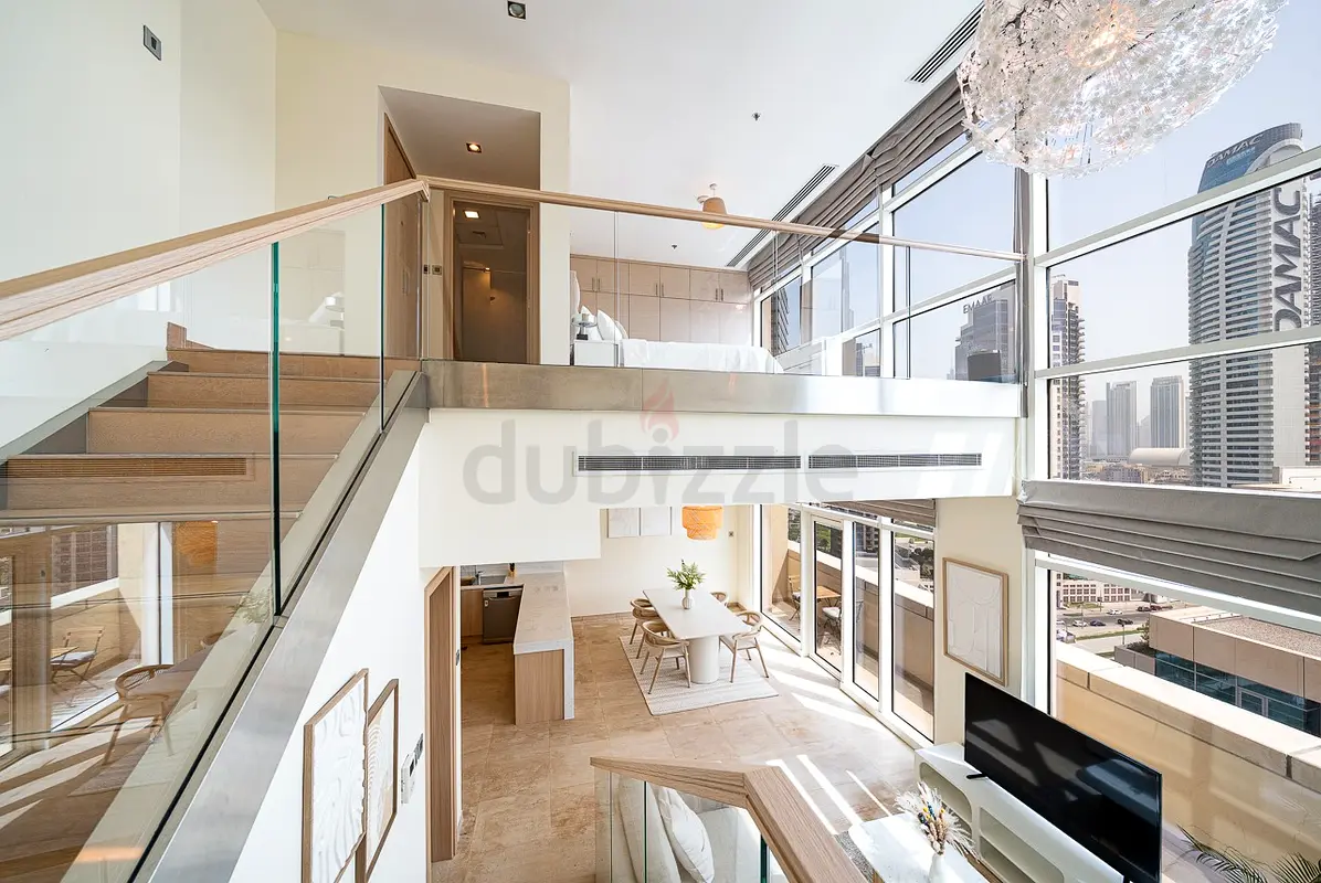 Property Details • Bay Square Building 1, Business Bay • Type: Spacious duplex / loft-style apartment • Size: 1,224.29 sq ft (114 sqm) • View: Burj Khalifa and skyline view – no direct overlooking • Ceiling: Double-height ceiling with floor-to-ceiling windows • Furnished: Fully furnished with high-quality furniture • Balcony: Long balcony overlooking the Burj Khalifa and skyline • Parking: 1 allocated parking space • Availability: Vacant / Ready to move in • Landlord: Direct owner