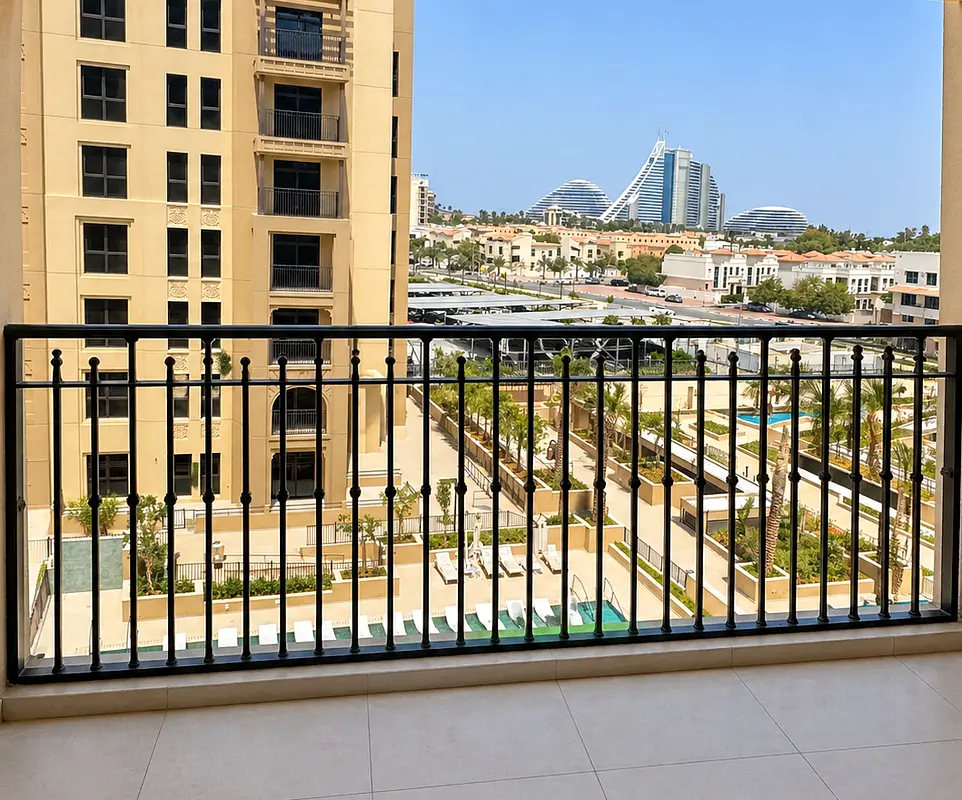 This 1-bedroom apartment in Jadeel Building 2 is available for rent in Madinat Jumeirah Living, Umm Suqeim, Dubai. The home offers an open-plan layout with a compact kitchenette, two bathrooms, and a balcony with views over the pool and landscaped courtyard. It is an unfurnished unit, suitable for residents looking to personalise their space in a modern community setting. Key Features: