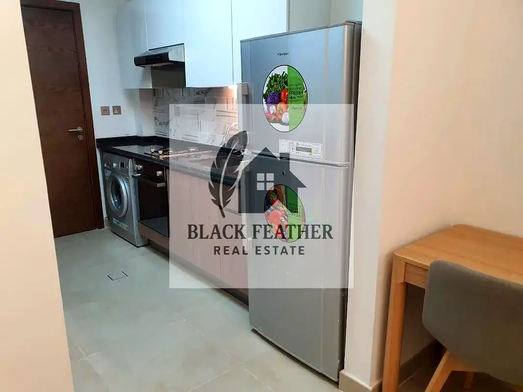 The main area combines the bed, seating and dining space in one efficient layout. A built-in wardrobe near the entrance offers organized storage, while tiled flooring and neutral walls provide an easy-to-maintain finish. The balcony is accessed via floor-to-ceiling glass, giving natural light and a clear outlook toward surrounding buildings and nearby roads. The open-plan kitchenette features a black countertop, gas hob, oven, sink and overhead cabinets for everyday cooking needs. A tall refrigerator and a front-loading washing machine are integrated along the counter, maximizing usable space. The layout allows clear visibility into the living and sleeping area, maintaining a compact yet functional flow from entrance to balcony. Shaista Azizi is a mid-rise residential building in Al Furjan offering facilities such as a swimming pool, modern gym, sauna, jacuzzi and covered parking. The building is served by high-speed elevators and 24-hour security, and common areas are maintained to provide a clean and organized environment for residents. Al Furjan is a family-oriented community with a network of pathways, cycling tracks, parks and shared amenities. Residents benefit from proximity to Al Furjan Metro Station, local pavilions with supermarkets, cafes, pharmacies and salons, as well as schools and nurseries within a short drive. Easy access to Sheikh Zayed Road and Sheikh Mohammed Bin Zayed Road supports daily commuting to key areas including Dubai Marina, Jebel Ali and Expo City.