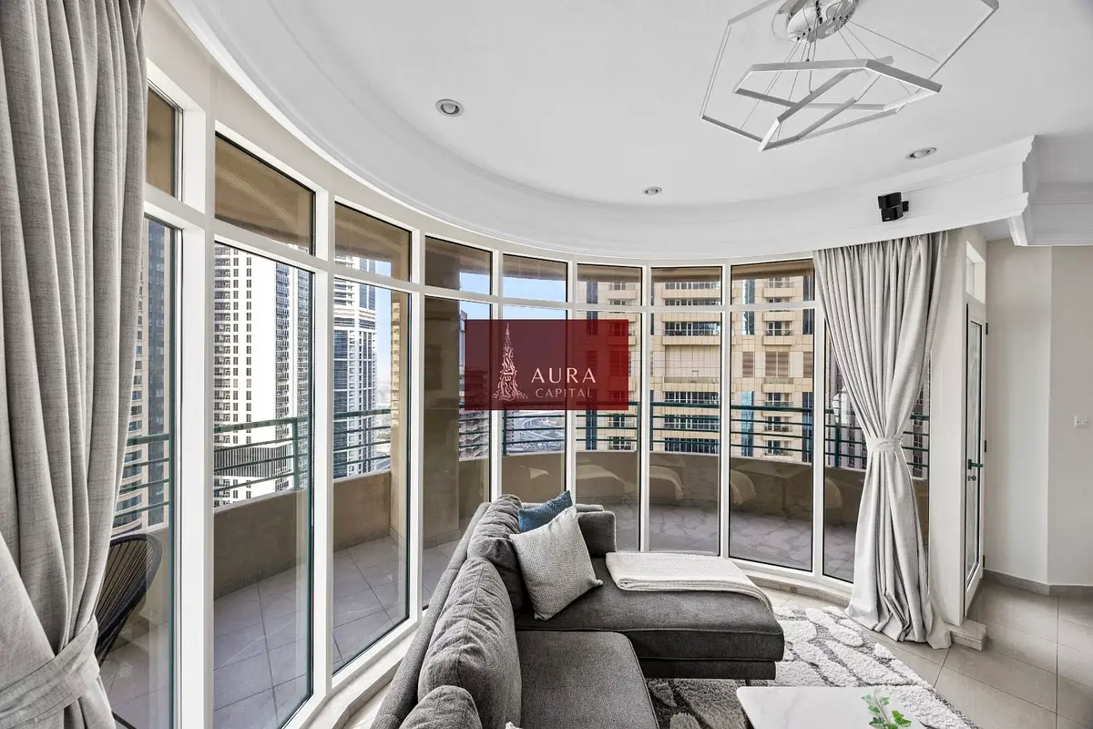 This furnished 2-bedroom apartment for rent in Marina Crown, Dubai Marina, offers a practical layout with bright living spaces and full-height windows. The home features multiple well-planned bedrooms, several modern bathrooms and an open-plan kitchen connected to the living area. Curved balconies and large windows provide wide views towards Dubai Marina, the sea and the surrounding skyline.