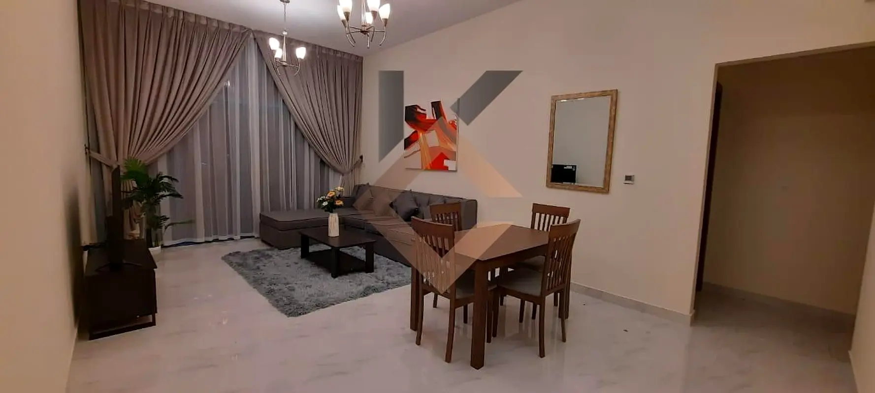 2-bedroom apartment for rent in Sydney Tower, Jumeirah Village Circle (JVC). The home offers a practical layout with an open-plan living and dining area, multiple modern bathrooms, and full furnishing throughout. Bedrooms include double beds, storage and full-height curtains, while balconies provide outdoor space with city and skyline views.