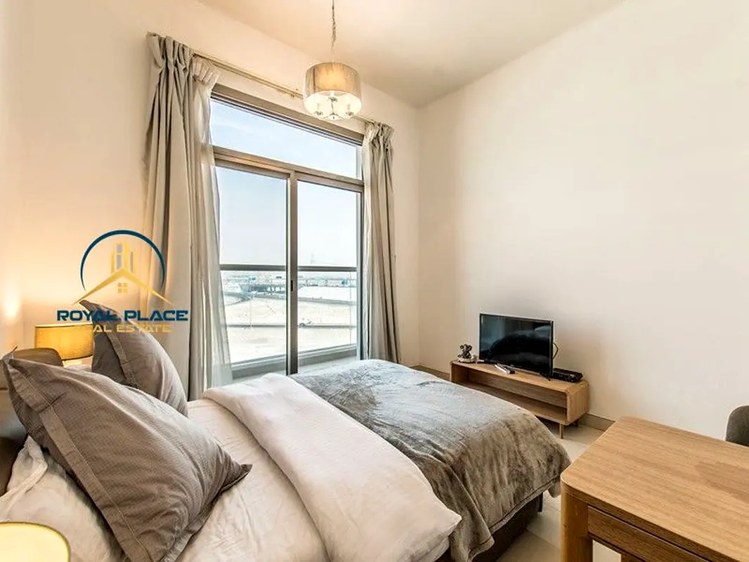 Furnished studio hotel apartment for rent in Azizi Roy Mediterranean, Al Furjan, Dubai. This open-plan unit combines sleeping, dining and kitchenette areas in one practical layout. Large floor-to-ceiling windows and sliding doors provide good natural light and showcase open community, road, sea and marina-style views from select angles.