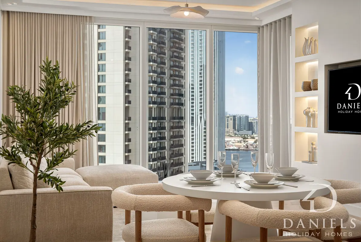 Stylish 2-bedroom apartment in Creek Gate Tower 2, Dubai Creek Harbour. Features a bright living area, fully equipped kitchen, and comfortable bedrooms, with access to building amenities and easy access to Creek Marina, parks, and dining options.