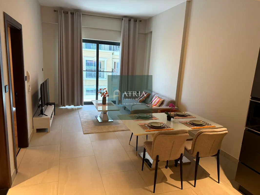 This 1-bedroom apartment for sale in Marquis Signature, Arjan, offers a practical layout with modern finishes. The home is presented furnished in the living and bedroom areas, featuring an open-plan arrangement that connects the seating, dining, and kitchen spaces. Neutral tones, tiled flooring, and large windows contribute to a bright interior with a downtown city view.