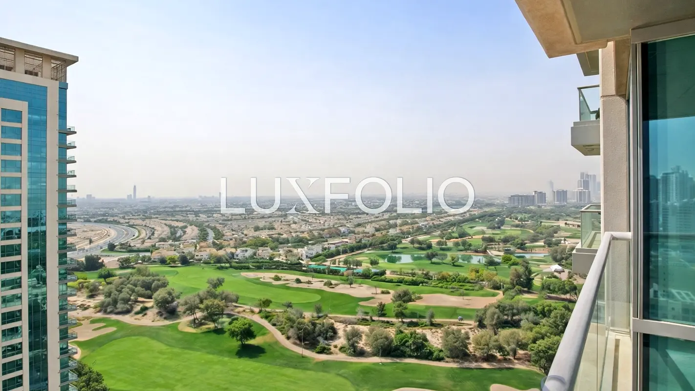 The apartment briefly consists of a large living area, a semi-closed kitchen, a double bedroom with an en-suite, a powder room & a good sized balcony with every room boasting incredible views over the Emirates golf course & the lakes.