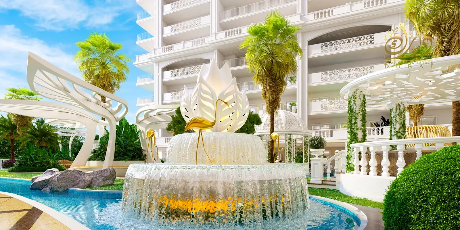• Seating areas distributed around pools and garden features