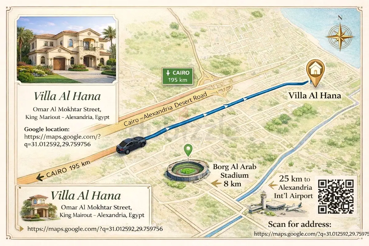 قريب من مطار برج العرب الدولي وطرق رئيسية، وساعة تقريبًا إلى الساحل الشمالي والعلمين.