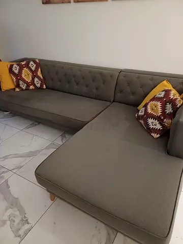 Grey L-shaped tufted sofa — good condition
